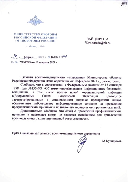 Следует отметить, что в целом и Министерство обороны РФ в своей деятельности не отклоняется от курса, предписанного федеральными законами. ВрИО начальника Главного военно-медицинского управления полковник М. Куандыков в своём письме